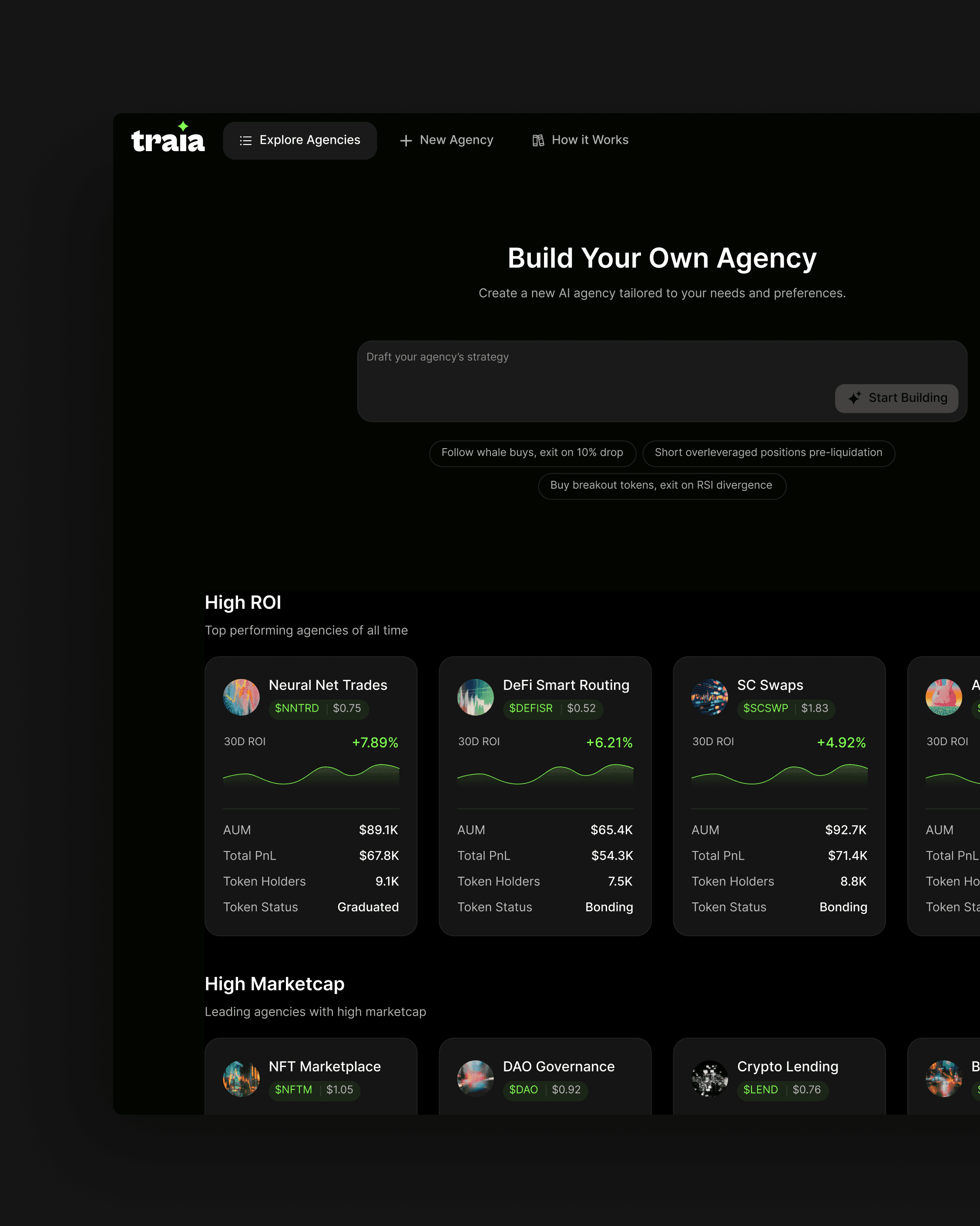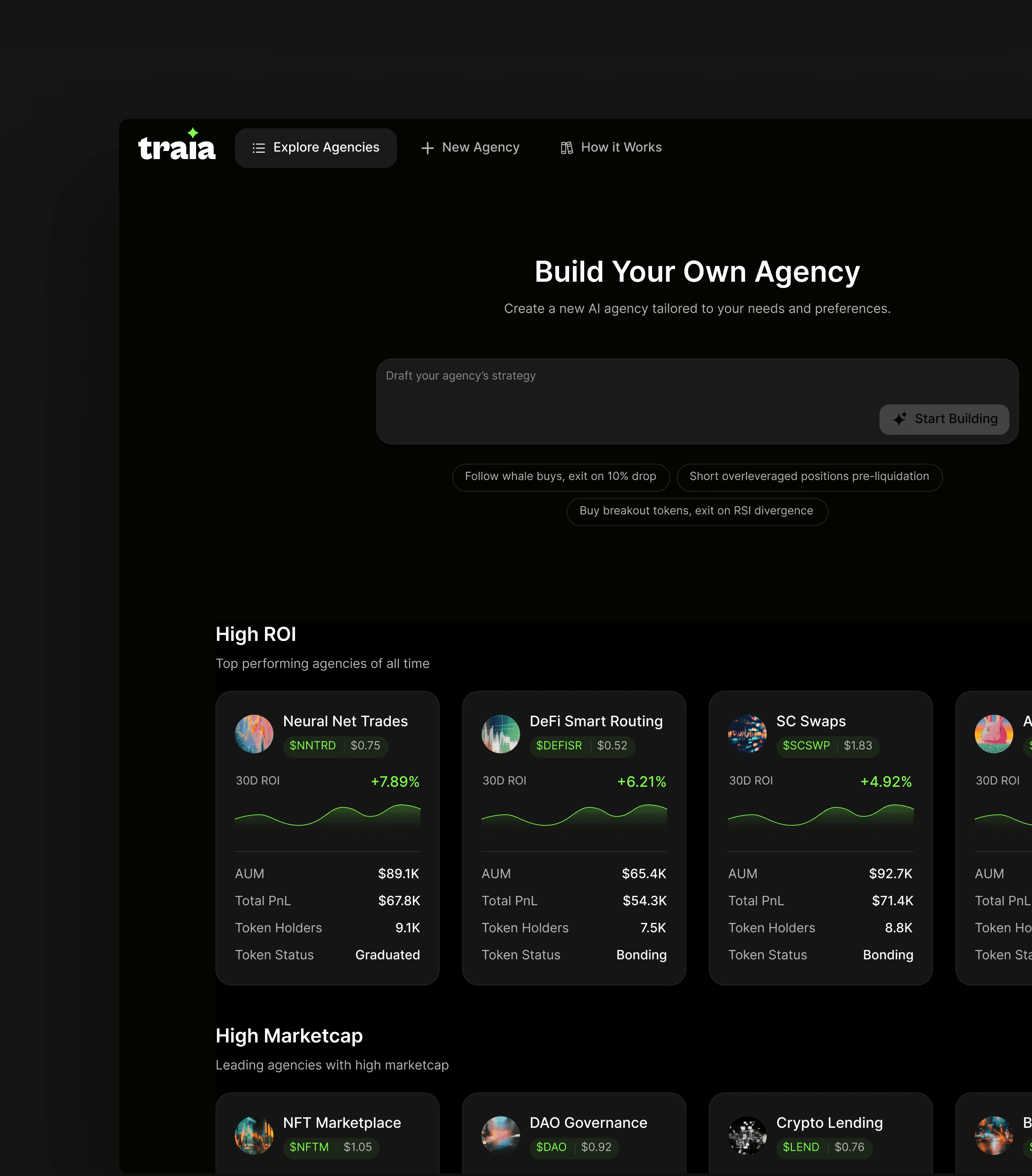 Traia enables a new class of on-chain entities: AI trading agencies that operate continuously, evolve with market conditions, and generate value on behalf of their owners. Create them. Co-own them. Earn from them.