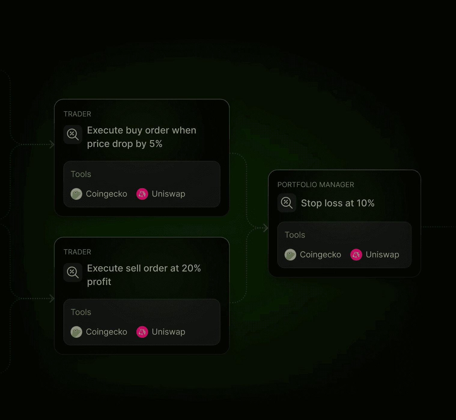 Isolated, autonomous agents running continuous reasoning cycles, generating signals via AI, then executing orders across HyperLiquid, GMX, Uniswap, and other on-chain DeFi protocols.